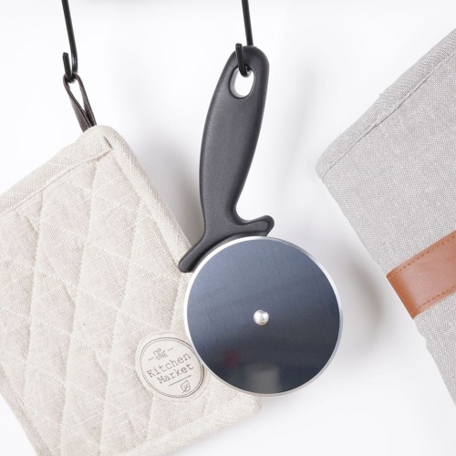 Runde Pizza -Hackmesser. Die Klinge aus Edelstahl. Bequemer Griff, die Möglichkeit, am Küchengeländer zu hängen.