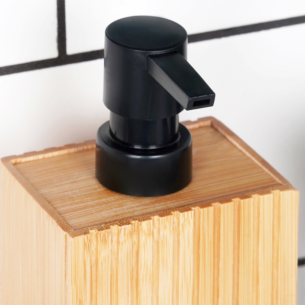 - Aus Bambusholz- Spender aus Bambusholz in natürlicher Farbe. Die Pumpe besteht aus schwarzem Kunststoff. Der Innenraum des Behälters besteht aus Kunststoff, der vor Feuchtigkeit schützt und die Reinigung erleichtert.