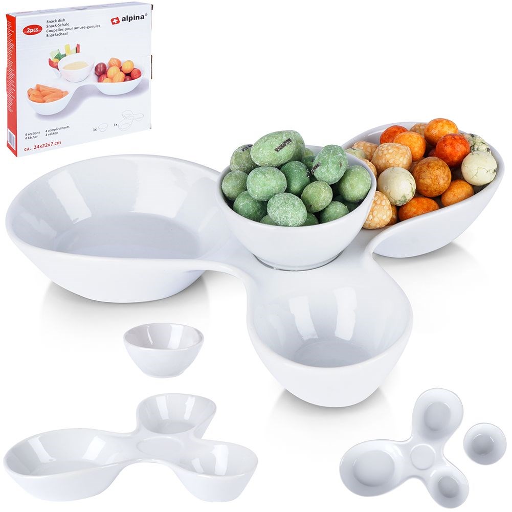 Eine eindrucksvolle Snackschale, aufgeteilt in drei unterschiedlich große Schalen und eine herausnehmbare Schale. Die Schüssel ist solide verarbeitet. Äußerst nützlich im täglichen Gebrauch, aber auch bei Besprechungen. Wir können darin salzige Snacks, Süßigkeiten oder Dips servieren. Die weiße Farbe sieht auf dem Tisch wunderschön aus und stellt ein dekoratives Element dar, das zum Rest des Geschirrs passt.Ein Originalprodukt der niederländischen Marke Alpina.Hergestellt nach europäischen Standards.
