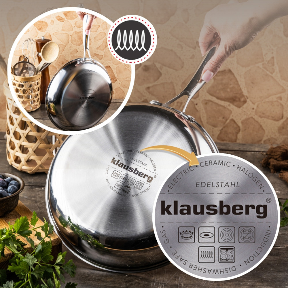 Die KLAUSBERG KB-9022 Bratpfanne mit einem Durchmesser von 24 cm ist ein hochwertiges Kochgeschirr für die tägliche Küche und anspruchsvollere Anwendungen. Durch die Kombination von moderner Wabentechnologie und robuster TRIPLY-Konstruktion bietet die Pfanne hervorragende Antihafteigenschaften, Langlebigkeit und gleichmäßige Erhitzung.