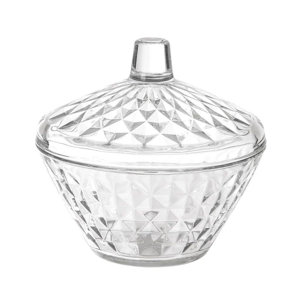Eine elegante Zuckerschüssel aus dickem, dekoriertem Glas. Ausgestattet mit einem Deckel mit einem Griff. Es funktioniert für losen Zucker und in Würfel.