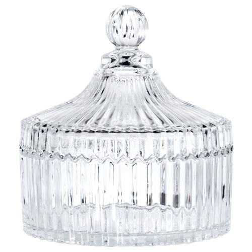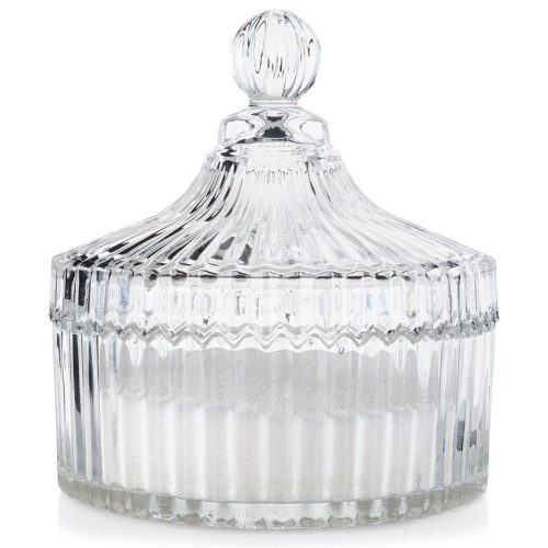 Elegante Zuckerschale mit einem Deckel. Wir werden es auch als Behälter zum Gießen von Kerzen verwenden. Der Konditor wird in eleganter Form gehalten, daher passt er perfekt zum verbleibenden Versprechen. Der Glasbehälter kann auch eine dekorative Funktion haben. Im Wohnzimmer oder Schlafzimmer platziert, wird es ein einzigartiges dekoratives Element sein.Originalprodukt der niederländischen Marke Alpina.Nach europäischen Standards hergestellt.