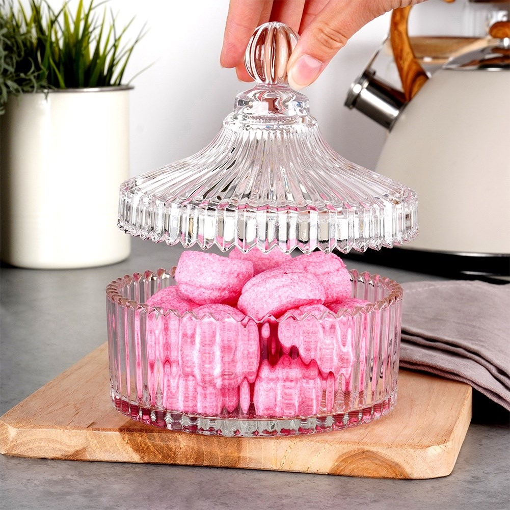 Eine elegante Zuckerschüssel aus Glas sieht aus wie ein Kristall. Auch ideal zum Gießen von Kerzen und als dekorative Behälter zum Aufbewahren von Snacks oder Süßigkeiten.