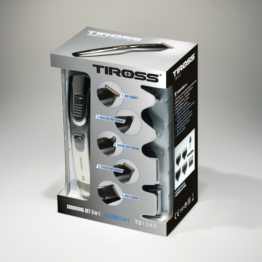 Professioneller 5-in-1-Haarschneider mit 5 austauschbaren Köpfen, der ein präzises Schneiden von Kopf-, Nasen- und Ohrenhaaren sowie das Schattieren und Stylen des Bartes gewährleistet.
