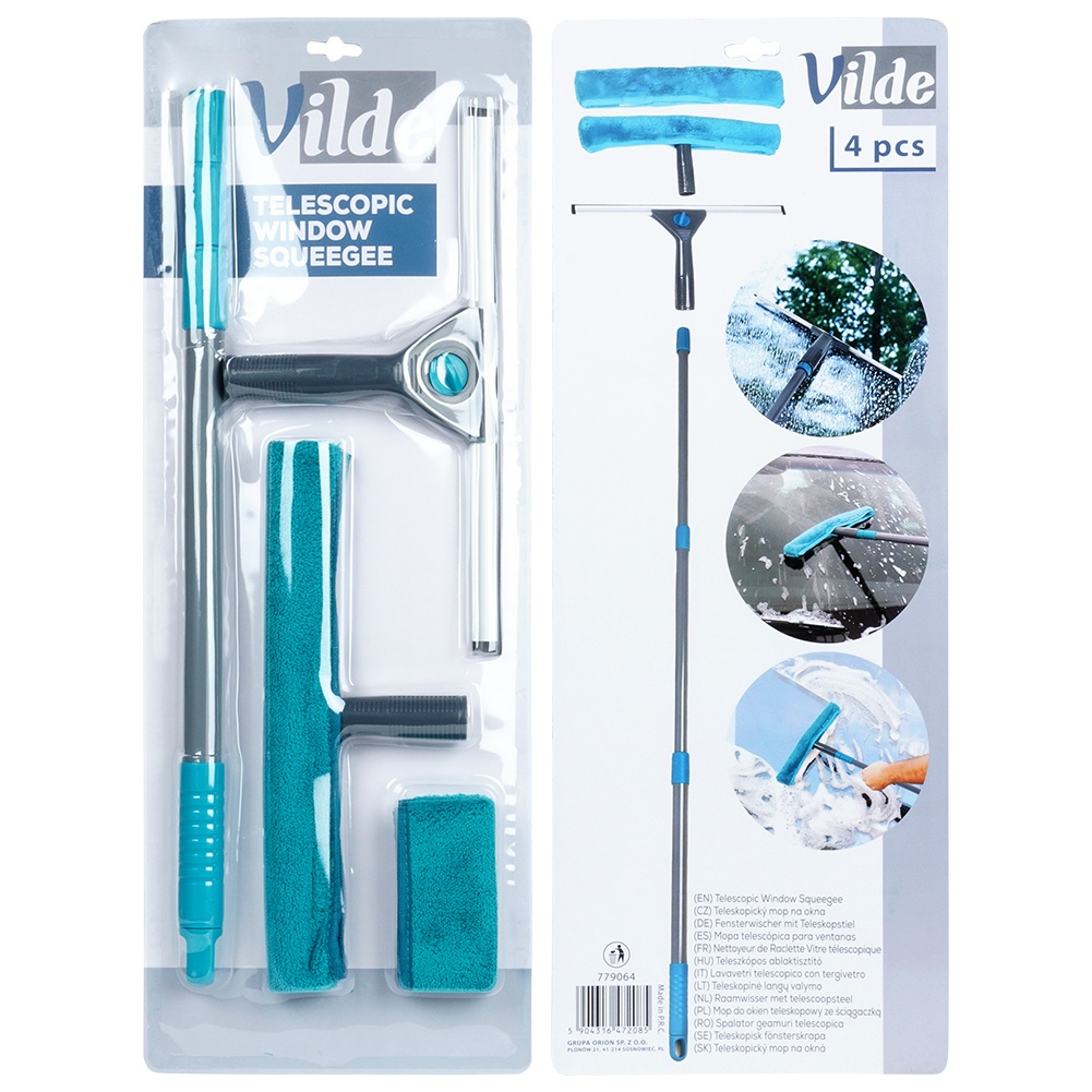 Teleskopwaschmaschine mit Abzieher und Mikrofasereinsatz. Dank des Teleskopstiels können wir mit dem Wischmopp auch schwer zugängliche Stellen erreichen, ohne eine Leiter, einen Ständer oder einen Stuhl benutzen zu müssen. Der Reiniger sorgt für eine bequeme und sichere Reinigung von Fenstern und Spiegeln. Mit dem Abzieher können Sie das Wasser richtig auffangen. Die im Set enthaltenen Tücher sind sehr saugfähig. Ein Set, das in jedem Zuhause und Büro nützlich ist.Original Vilde-Produkt.Hergestellt nach europäischen Standards.