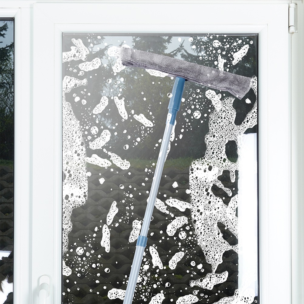 Ein äußerst nützliches Fensterreinigungsset bestehend aus einem Einwascher, einem Abzieher auf einer Teleskopstange und einem Mikrofasereinsatz.