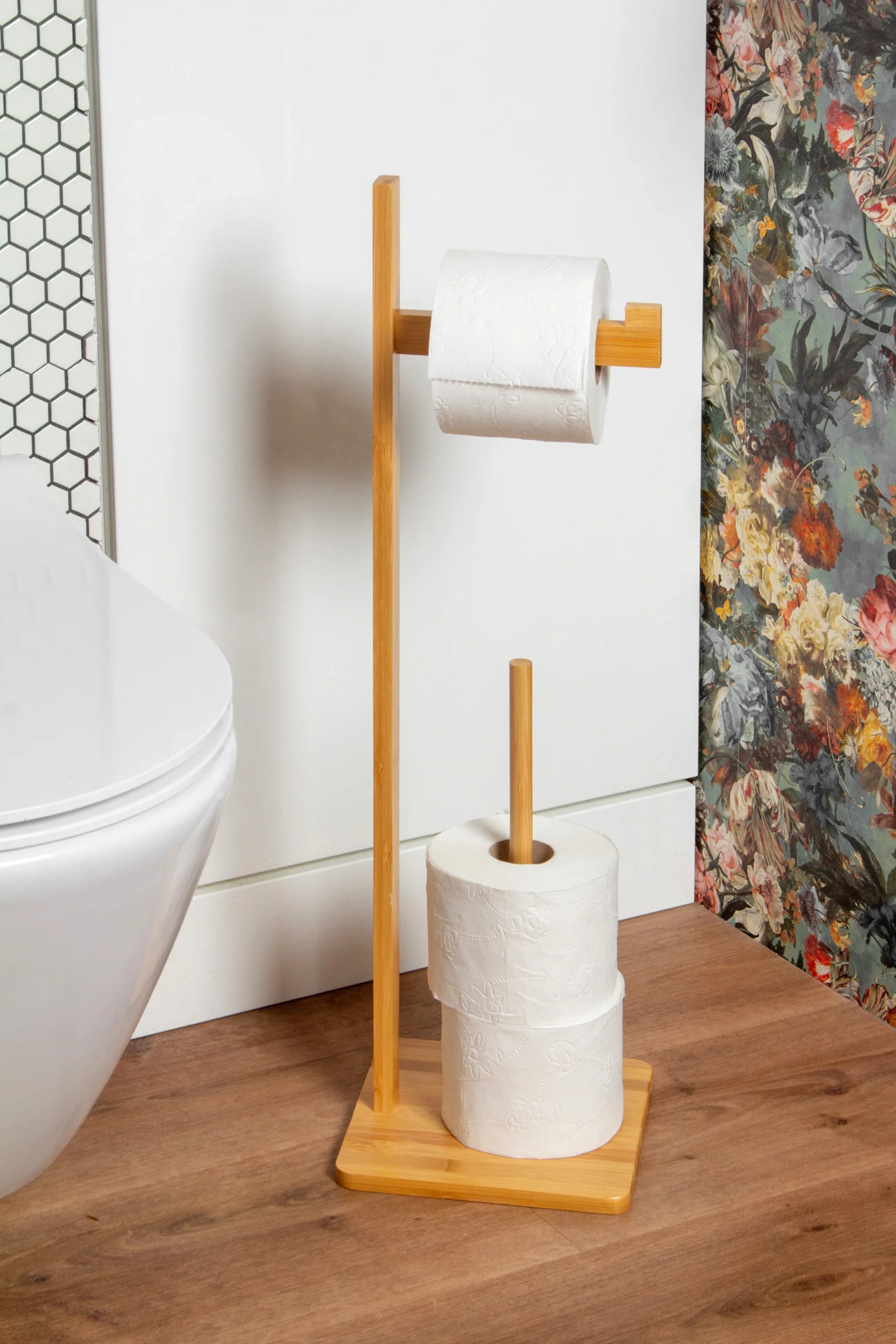Dankezwei ArmeDer Ständer ermöglicht die gleichzeitige Aufbewahrung von gebrauchtem Papier und Ersatzrollen und sorgt so für vollen Komfort und Ordnung im Badezimmer. Eine stabile Basis sorgt für eine sichere Nutzung und die Bambusoberfläche ist leicht zu reinigen.