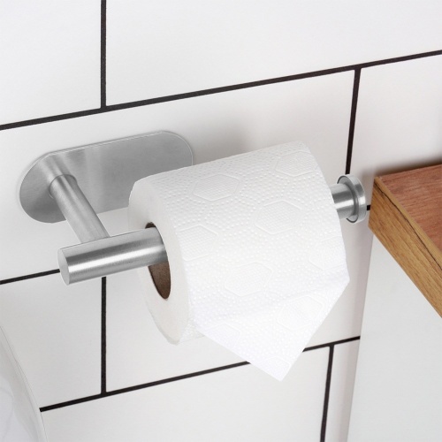 Mit doppelseitigem Klebeband befestigter Toilettenpapierhalter für das Badezimmer. Aus Edelstahl in silberner Farbe. Nützlich in jedem Badezimmer.