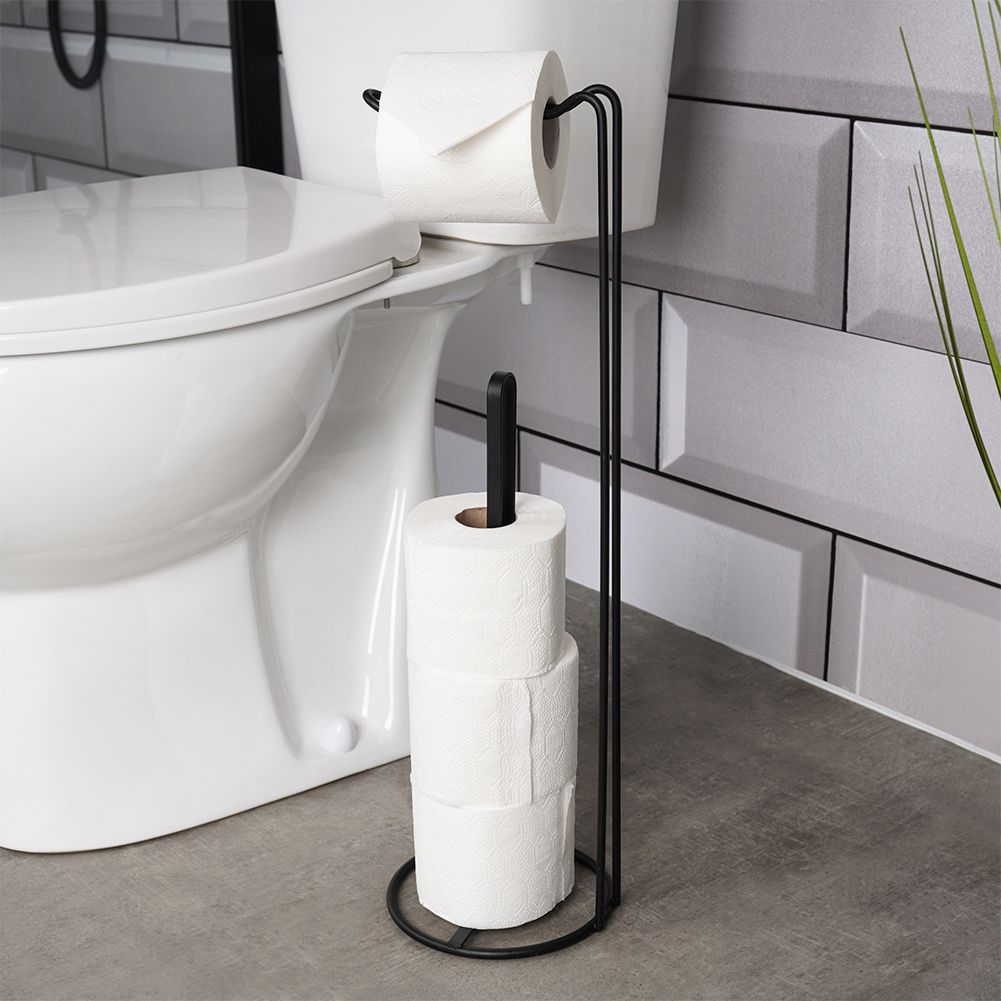 Badezimmer-Toilettenpapierständer mit Halter. Hergestellt aus Metall in mattschwarzer Farbe. Es bietet Platz für 4 Rollen Toilettenpapier. Nimmt wenig Platz ein.