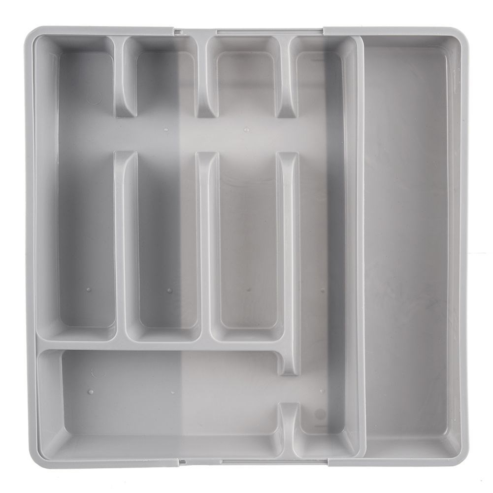 Verstellbarer Organisator für Besteck- und Küchenutensilien für die Schublade. Aus Kunststoff in grauer Farbe gemacht. Abhängig von der Einstellung verfügt es über 5 bis 7 Fächer.