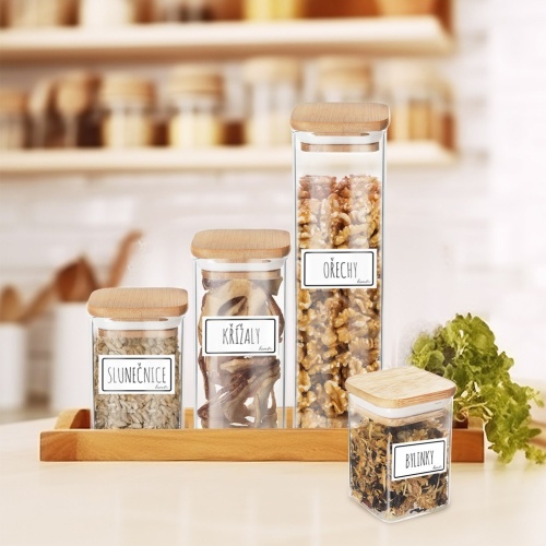 Boroczeg -Glasbehälter mit Bambusholzdeckel. Dank der Silikondichtung, quadratische Form.