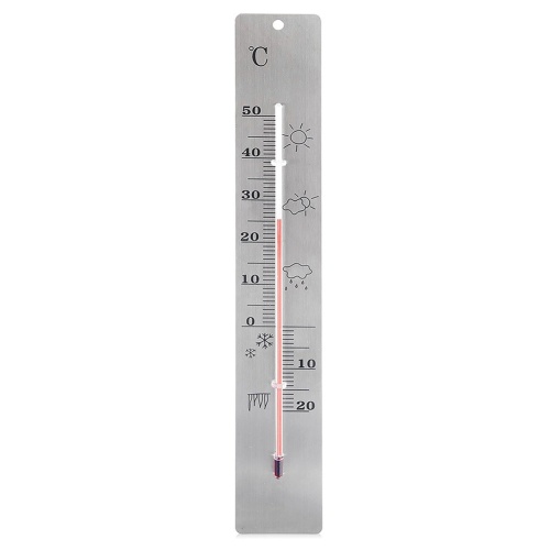 Das Thermometer informiert über die aktuelle Temperatur außerhalb und innerhalb der Räume. Es hat ein klassisches Aussehen und eine klare Skala. Aus Edelstahl.