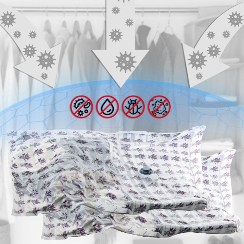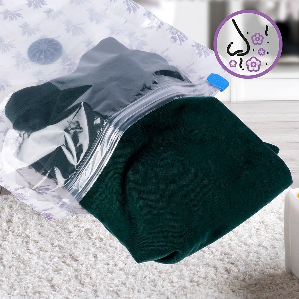 Ein Vakuumbeutel, der zum Aufbewahren von Kleidung, Bettwäsche, Kuscheltieren usw. geeignet ist. Dadurch sparen wir Platz bei der Lagerung. Hinterlässt einen zarten Lavendelduft.