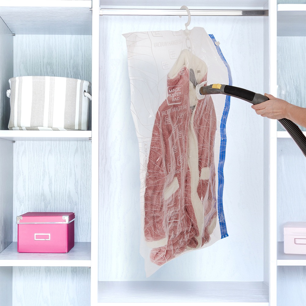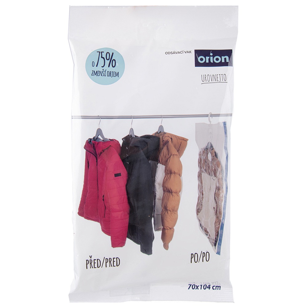 - Vakuumbeutel mit Aufhänger- Ein Vakuumbeutel mit Aufhänger zum Aufbewahren verschiedener Gegenstände und zur Reduzierung ihres Volumens. Darüber hinaus schützt es Stoffe vor Staub, Schmutz, Feuchtigkeit, Milben und Motten. Die Tasche kann auch als klassische Kleiderhülle verwendet werden. Die Tasche hat die Maße 70 x 104 cm.