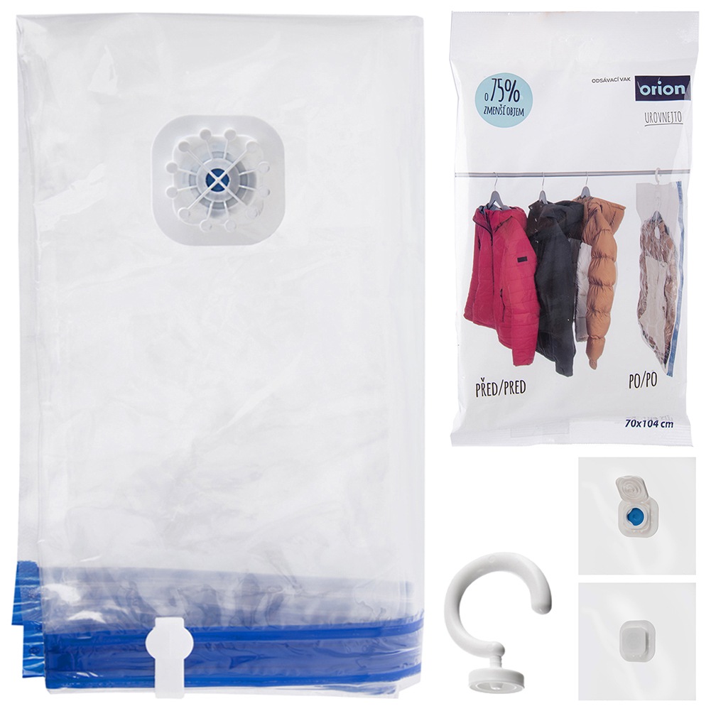 Ein Vakuumbeutel zum Aufbewahren von Kleidung, Spielzeug oder zusätzlicher Bettwäsche. Das Set enthält einen Kleiderbügel, mit dem Sie den Beutel aufhängen können. Dadurch gewinnen Sie mehr Platz bei der Aufbewahrung von Kleidung und Bettwäsche. Die Beutel schützen die gelagerten Produkte vor Staub, Schmutz, Milben und Motten. Extrem einfach zu bedienen.Originalprodukt der tschechischen Marke Orion.Hergestellt nach europäischen Standards.