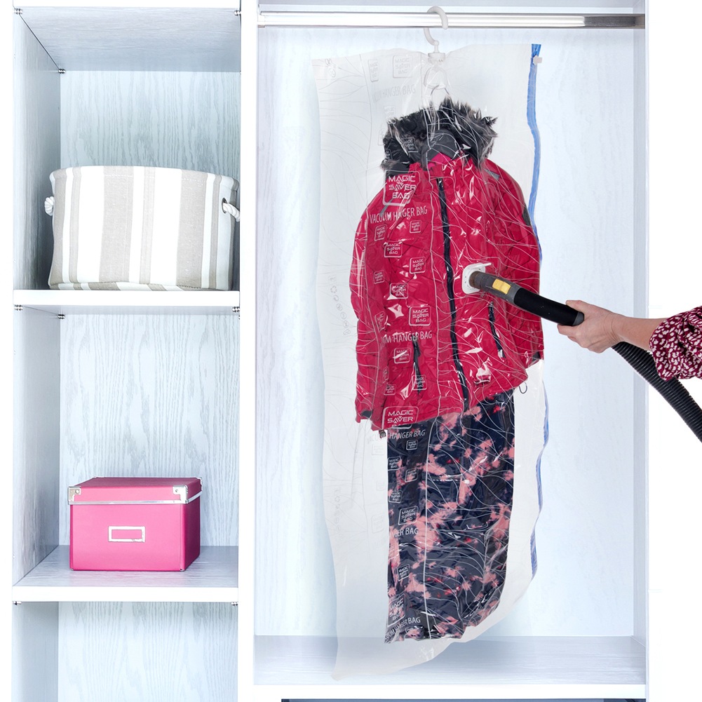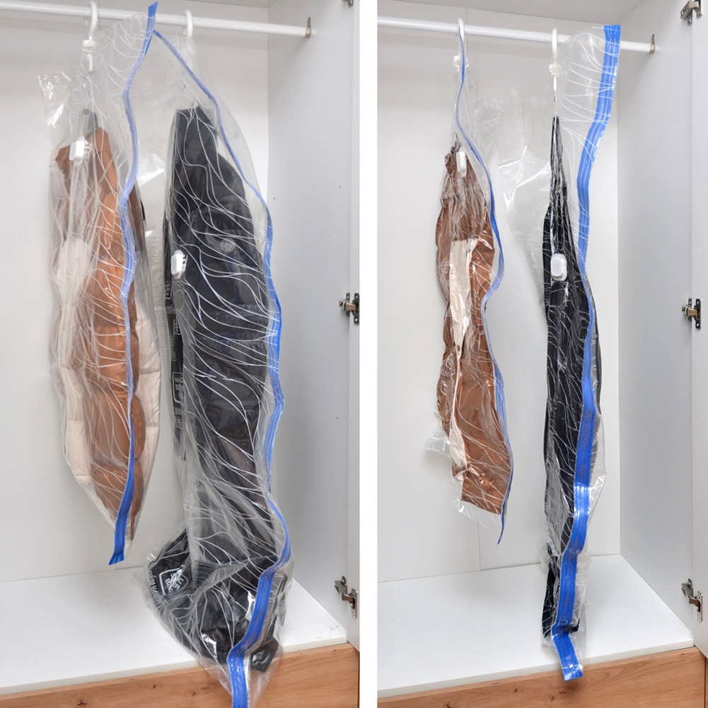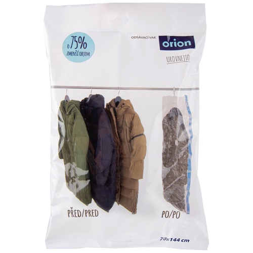 - Vakuumbeutel mit Aufhänger- Ein Vakuumbeutel mit Aufhänger zum Aufbewahren verschiedener Gegenstände und zur Reduzierung ihres Volumens. Darüber hinaus schützt es Stoffe vor Staub, Schmutz, Feuchtigkeit, Milben und Motten. Die Tasche kann auch als klassische Kleiderhülle verwendet werden. Die Tasche hat die Maße 70 x 144 cm.