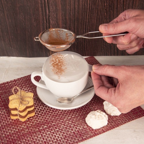 - Festlich- Ein Satz von sechs Vorlagen mit Weihnachtsmotiven zum Dekorieren von Kaffee und Desserts. Die Vorlagen haben einen Durchmesser von 8,5 cm und ihre Länge mit einem Griff beträgt 13 cm.