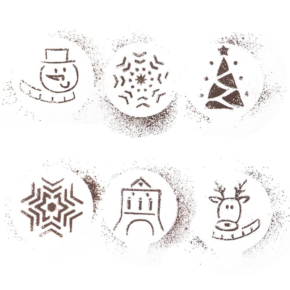 Ein Satz von sechs Weihnachtsvorlagen für Kaffee und Dessertdekoration. Sie erzeugen wirksame Muster mit Kakao, Zimt, Schokolade, Puderzucker oder farbenfrohen Streuseln.