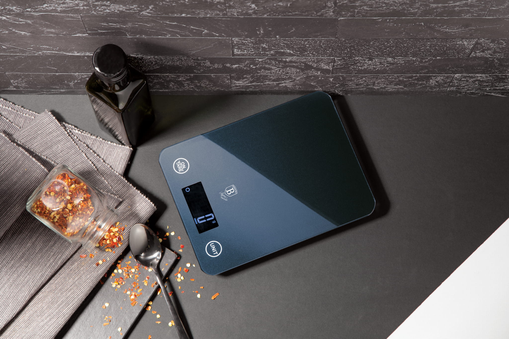 Super płaska waga kuchenna BERLINGER HAUS. Praktyczna i estetyczna w kolorystyce linii AQUAMARINE, wykonana ze szkła hartowanego.