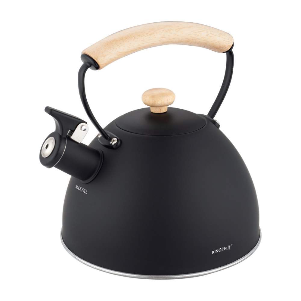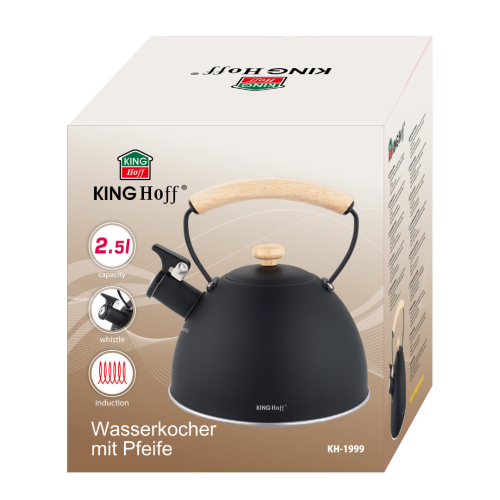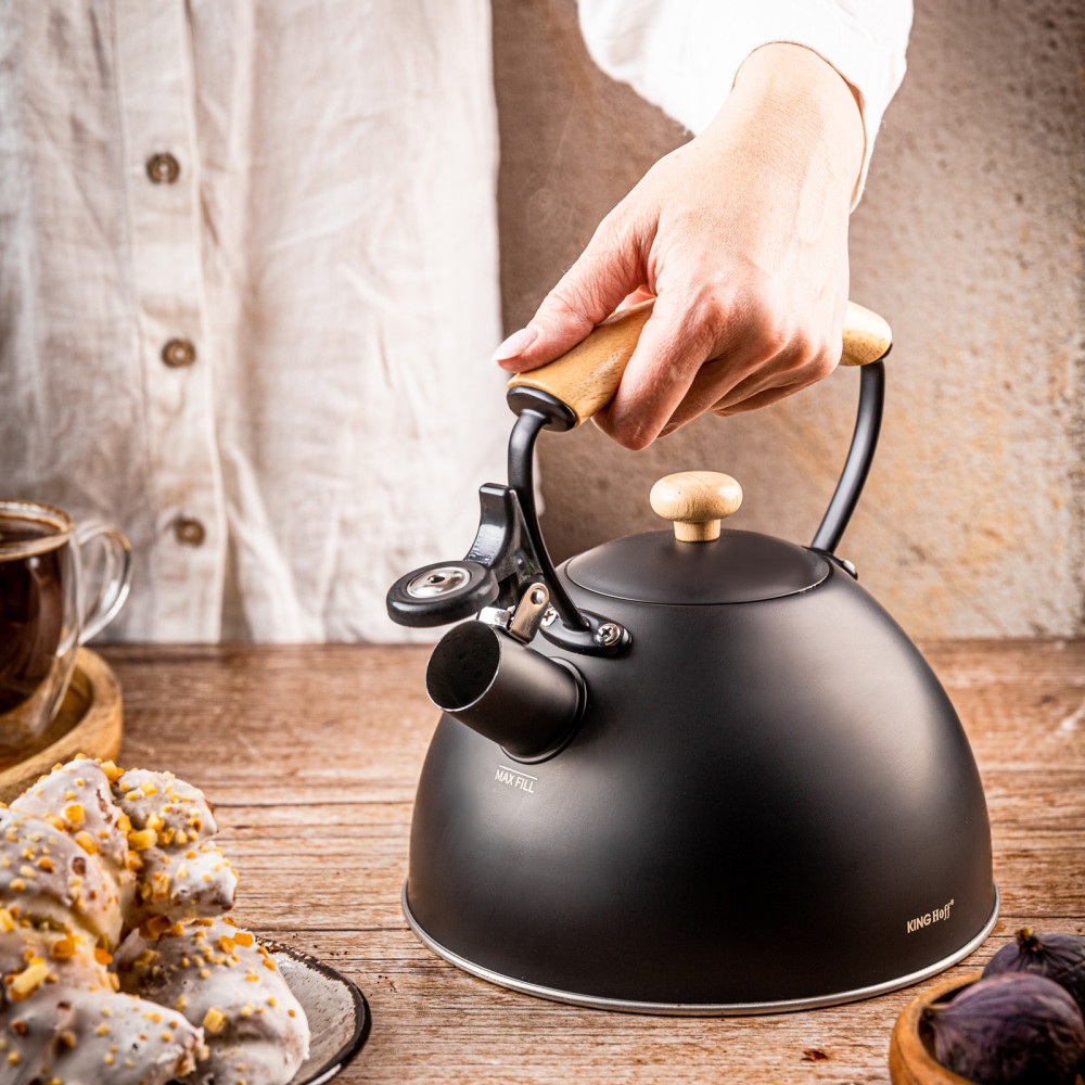 Wasserkessel Flötenkessel mit Pfeife, 2 L, schwarz, Holzgriff, Edelstahl KINGHOFF KH-1999