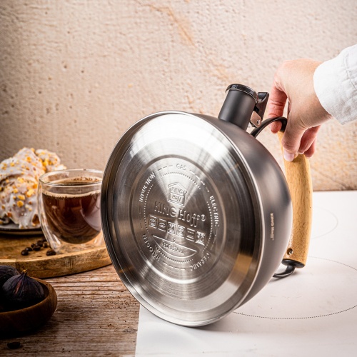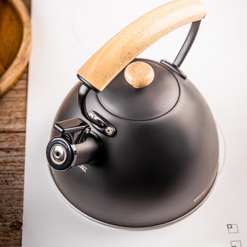 Der Wasserkocher verfügt über einen lauten Pfeifton, einen praktischen Hebel am Ausguss und einen ergonomischen Griff aus Naturholz, der angenehm in der Hand liegt. Dank seiner Kompatibilität mit allen Herdarten haben Sie völlige Freiheit bei der Verwendung.