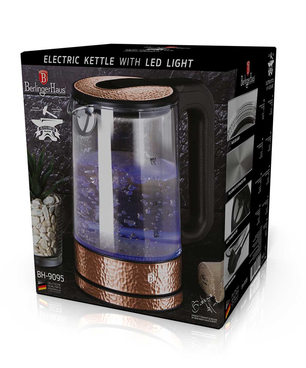 Eleganter und moderner Wasserkocher von BERLINGER HAUS aus der Linie ROSEGOLD Metallic aus Edelstahl und Borosilikatglas. Sie passt perfekt zum Geschirr und Küchenzubehör dieser Firma. Das blaue LED-Licht beleuchtet das Wasser während des Kochens und erzeugt einen interessanten optischen Effekt.