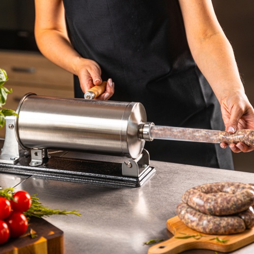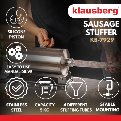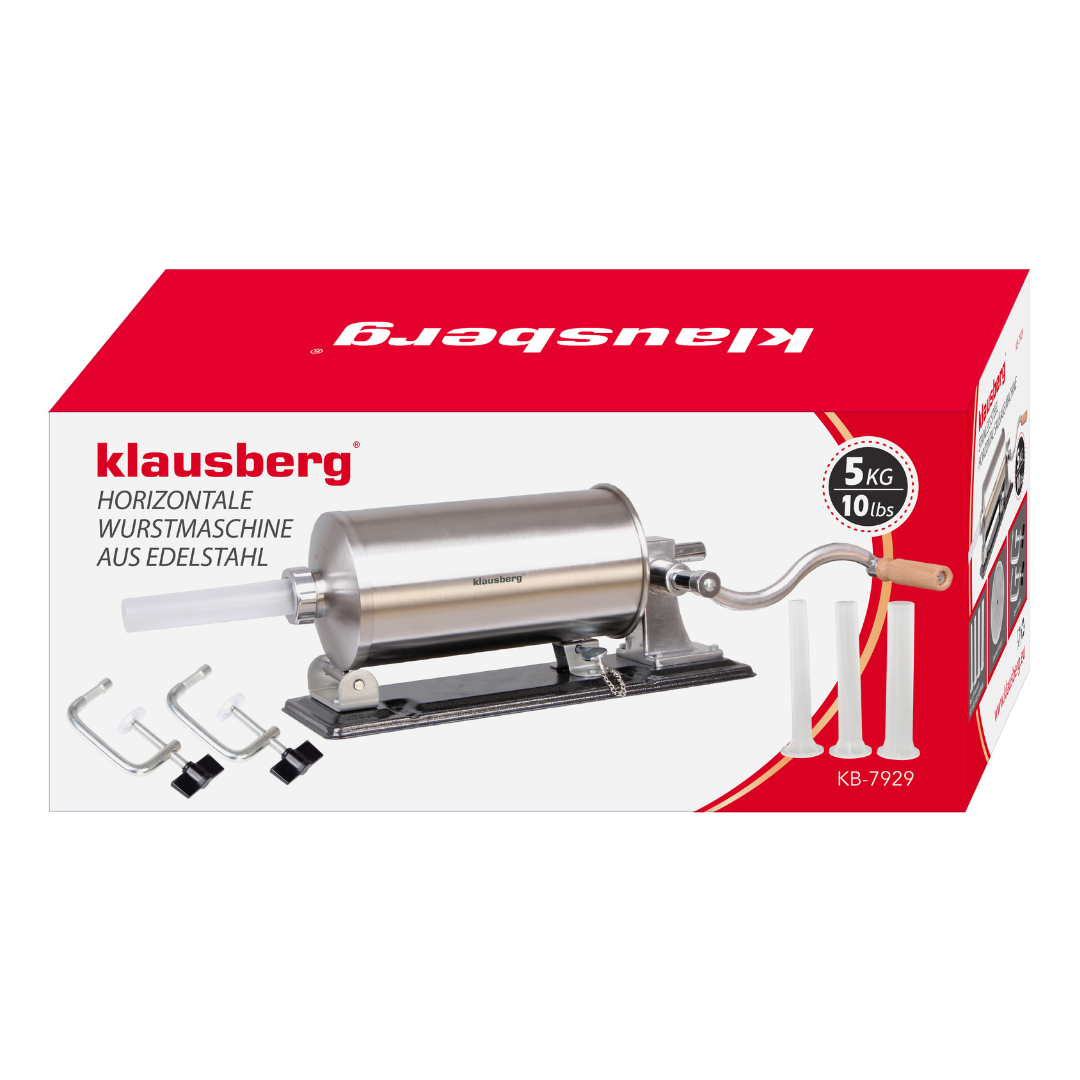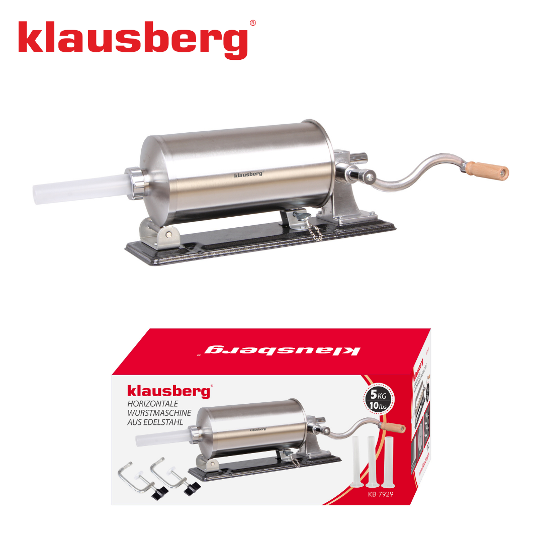 Der KLAUSBERG KB-7929 horizontale Wurstfüller 5,0 kgist ein robustes und funktionelles Gerät, das die Zubereitung von hausgemachten Fleischprodukten erleichtert. Es ist aus hochwertigem Edelstahl gefertigt und garantiert Langlebigkeit, Hygiene und Benutzerfreundlichkeit. Dank seines großen Fassungsvermögens von 5 kg eignet er sich sowohl für die gelegentliche Zubereitung von Würstchen als auch für größere Mengen an hausgemachten Produkten. Die stabile horizontale Konstruktion und die robuste Befestigung auf der Arbeitsplatte sorgen für Komfort und Sicherheit bei der Arbeit, während die manuelle Bedienung mit einer praktischen Kurbel die volle Kontrolle über den Füllvorgang ermöglicht.
