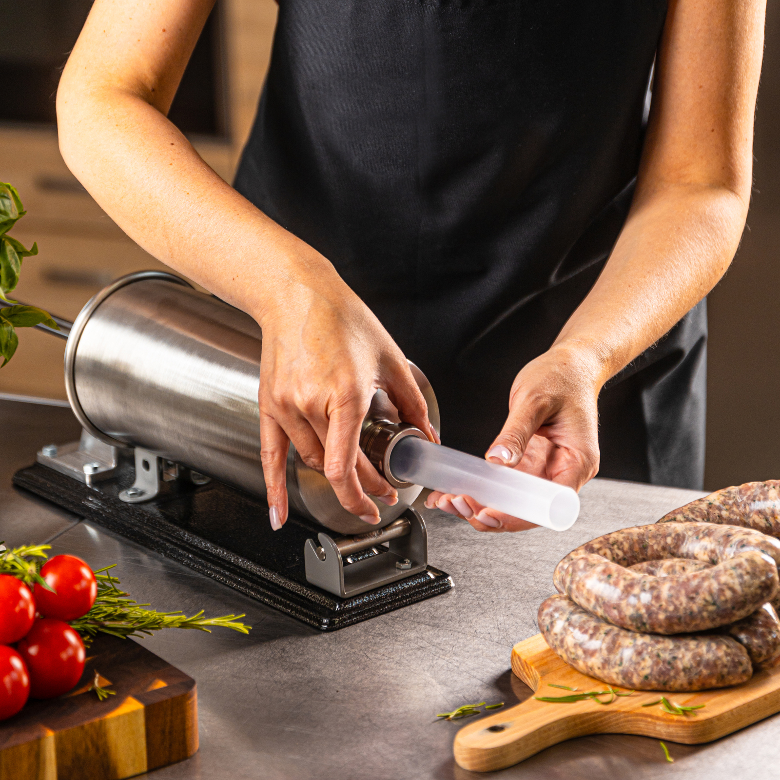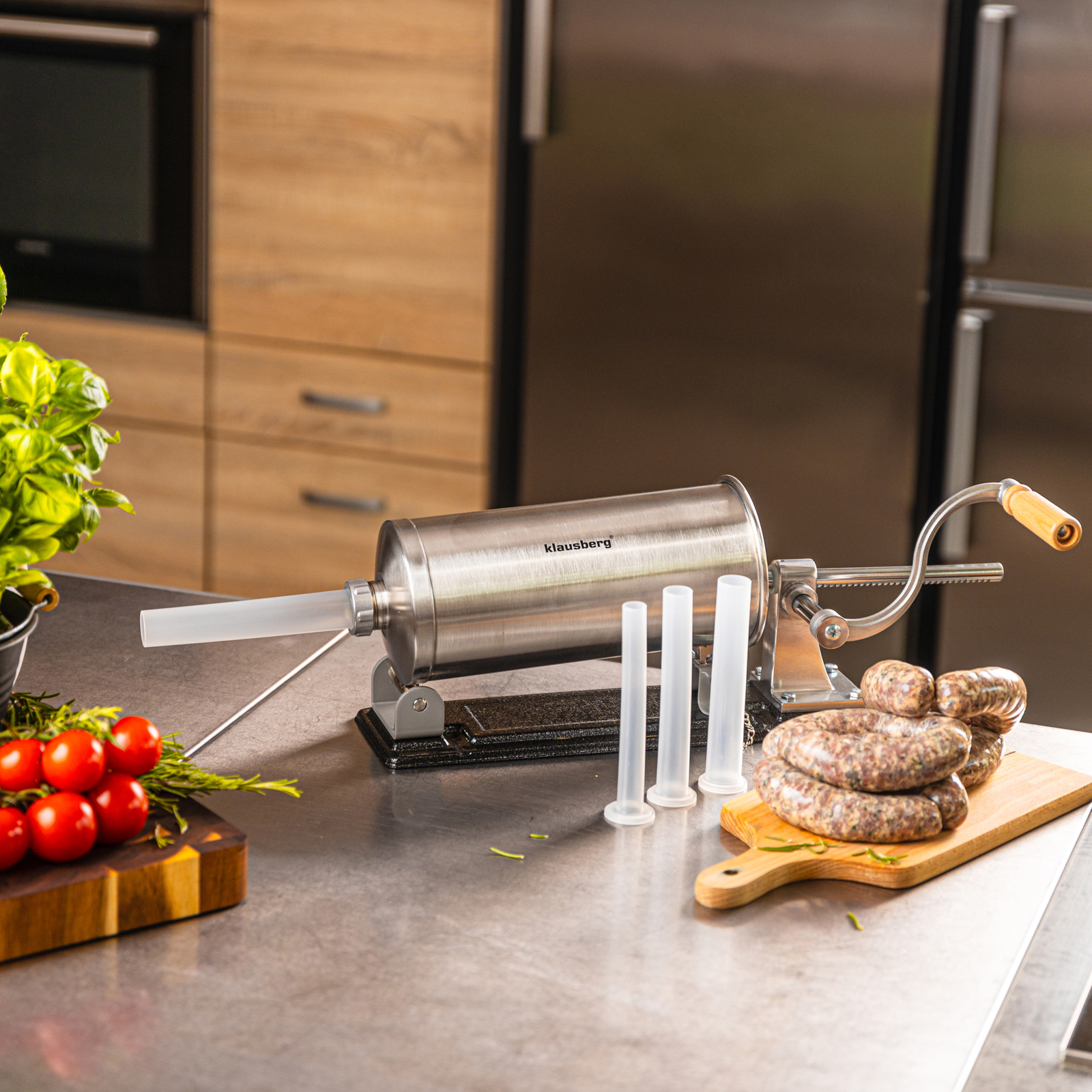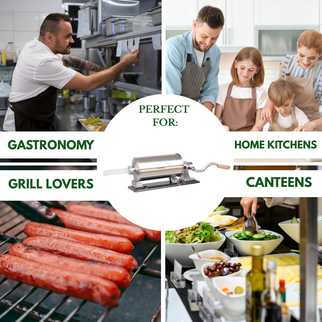 Der KLAUSBERG KB-7929 horizontale Wurstfüller 5,0 kgist ein robustes und funktionelles Gerät, das die Zubereitung von hausgemachten Fleischprodukten erleichtert. Es ist aus hochwertigem Edelstahl gefertigt und garantiert Langlebigkeit, Hygiene und Benutzerfreundlichkeit. Dank seines großen Fassungsvermögens von 5 kg eignet er sich sowohl für die gelegentliche Zubereitung von Würstchen als auch für größere Mengen an hausgemachten Produkten. Die stabile horizontale Konstruktion und die robuste Befestigung auf der Arbeitsplatte sorgen für Komfort und Sicherheit bei der Arbeit, während die manuelle Bedienung mit einer praktischen Kurbel die volle Kontrolle über den Füllvorgang ermöglicht.