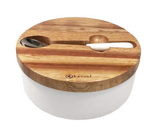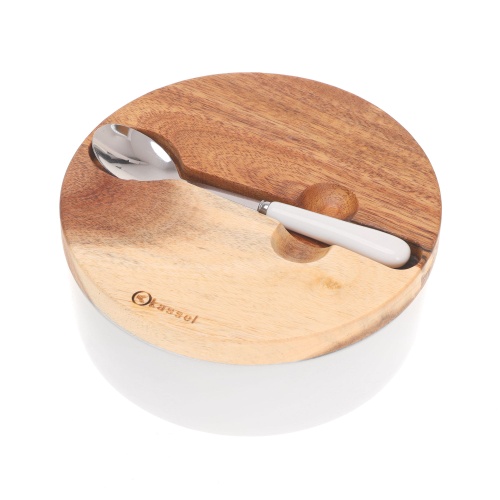 Zuckerdose aus Porzellan in der Farbe Weiß mit einem Deckel aus Akazienholz.