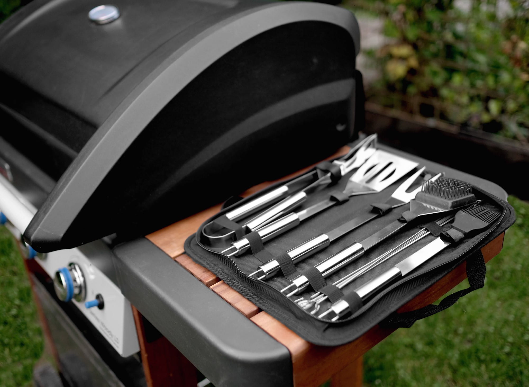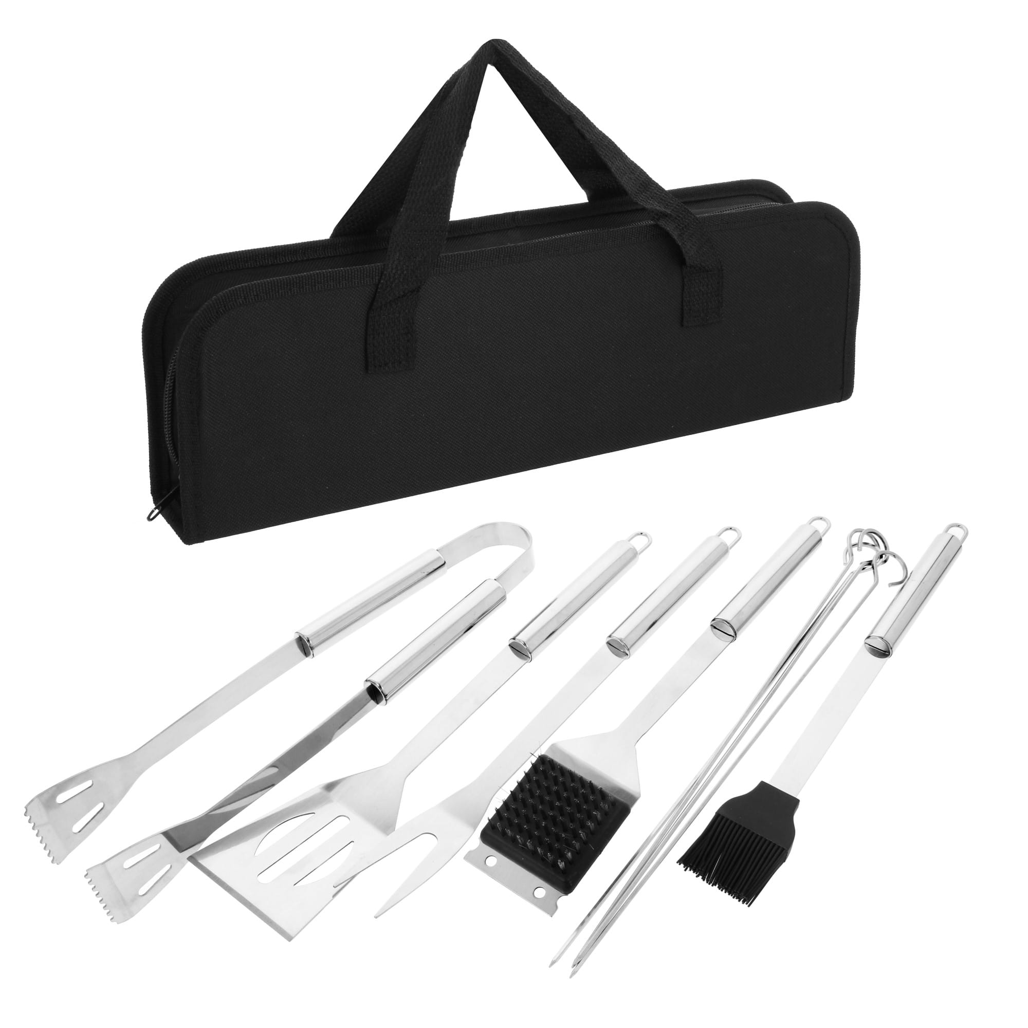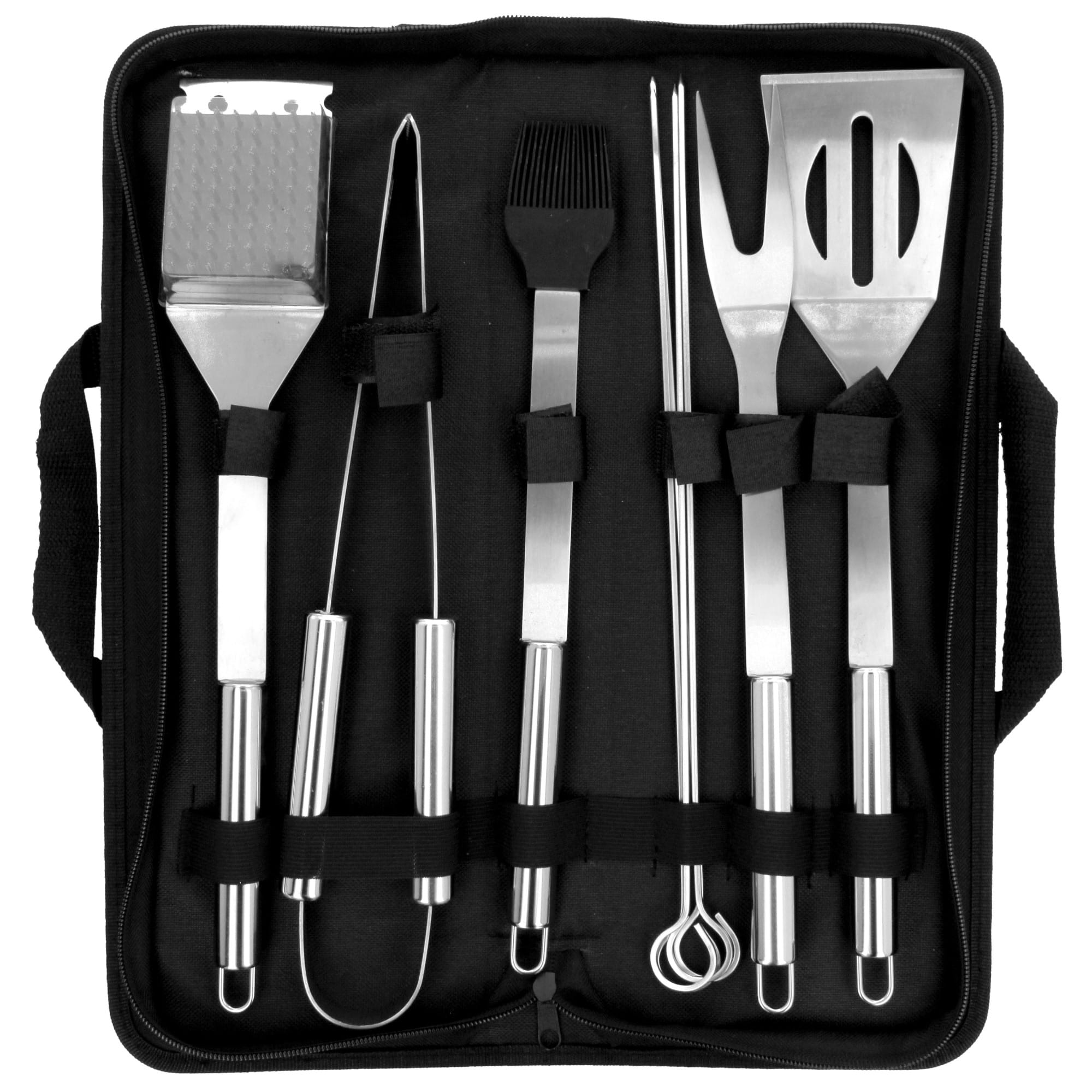 A 10-piece set of barbecue utensils in a carrying case.