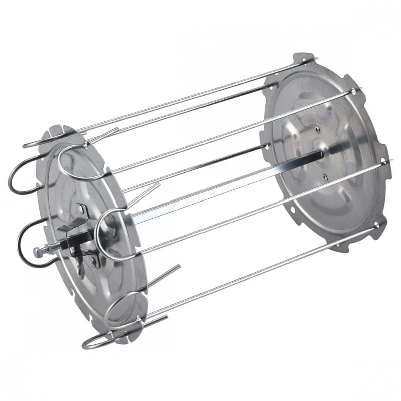 - Accessories include: 3 shelves with baking holes, a chicken rotisserie with a handle, 8 mini skewer sticks, 2 Retaining wheels, an oil drip tray and a rotating basket.