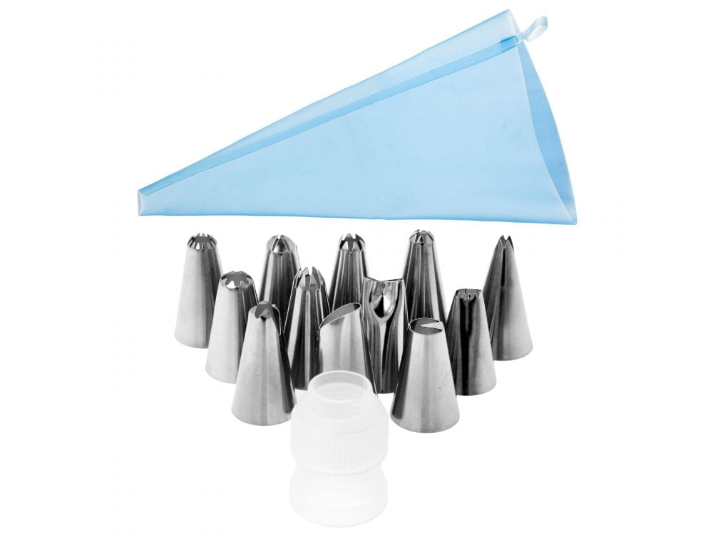 A 14-piece set of accessories for decorating and filling confectionery products including a sleeve, tips and a squeezer to make it easier to squeeze the mixture out of the sleeve. Perfect for confectionery beginners as well as professionals. The set has been composed to allow you to make spectacular decorations. Ideal for creating stars, rosettes, flowers, leaves, spiral patterns and dots.