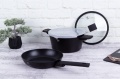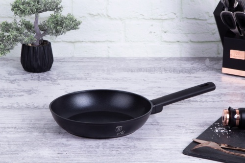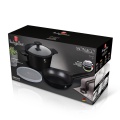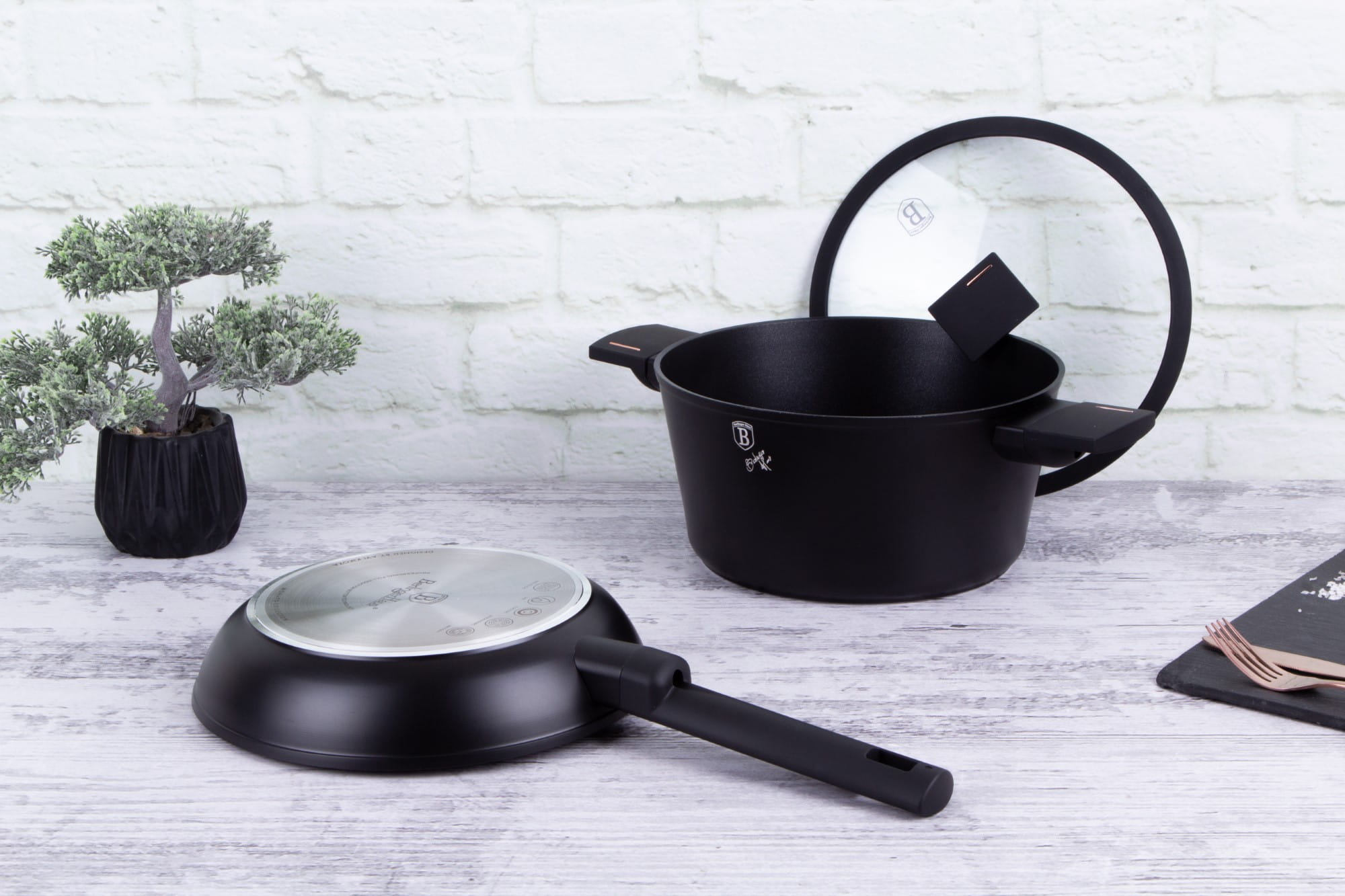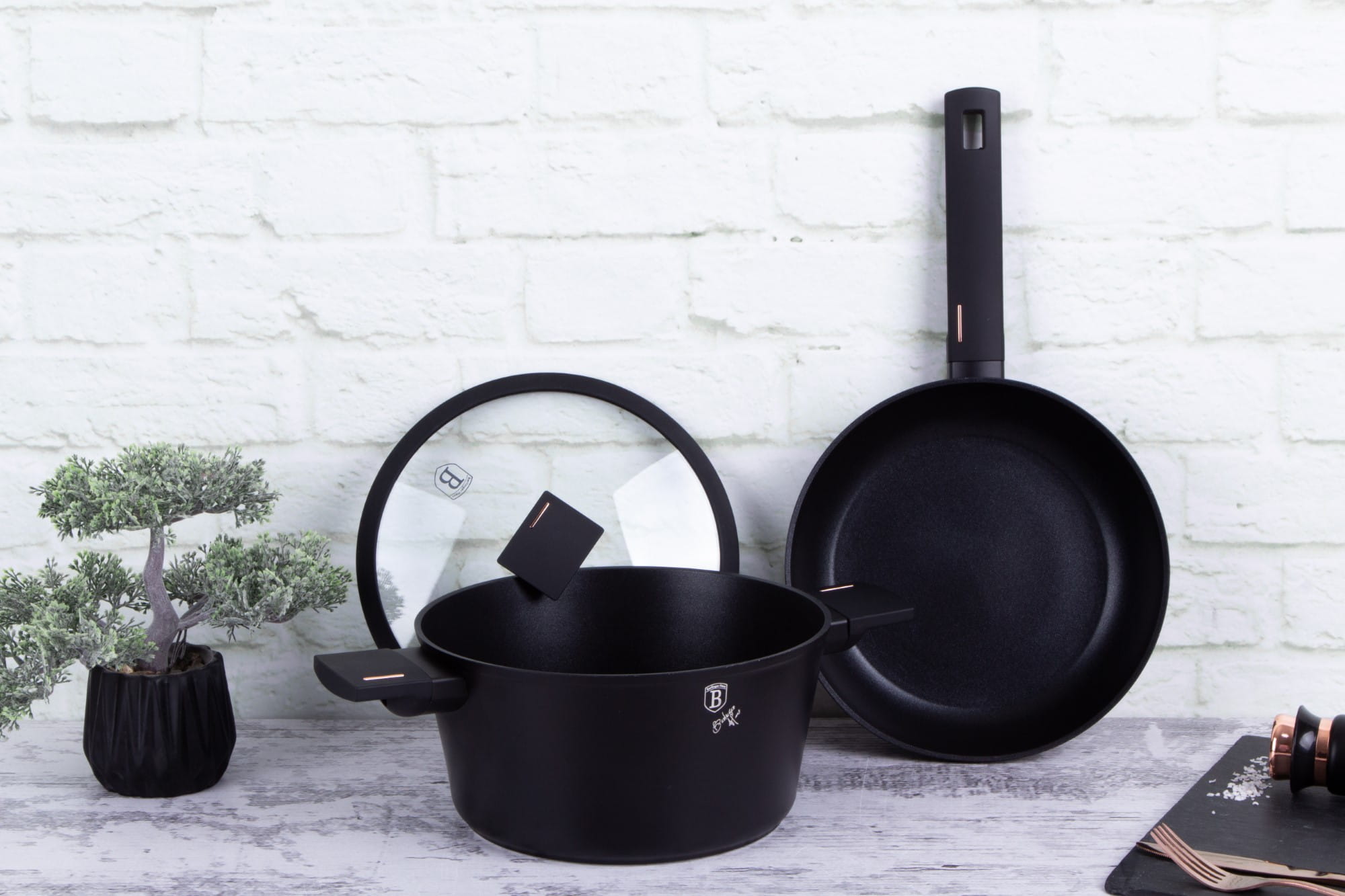 Set of dishes (pot + pan) with a diameter of 24cm by BERLINGER HAUS from the MONACO series, dishes from this series are made of high-quality forged aluminium coated inside with titanium coating with a very high hardness coefficient. The outer coating in matt black. These attractive and fashionable cookware are equipped as standard with SOFT TOUCH handles (silicone grip) and are suitable for all types of cookers: gas, electric, ceramic, halogen, induction.