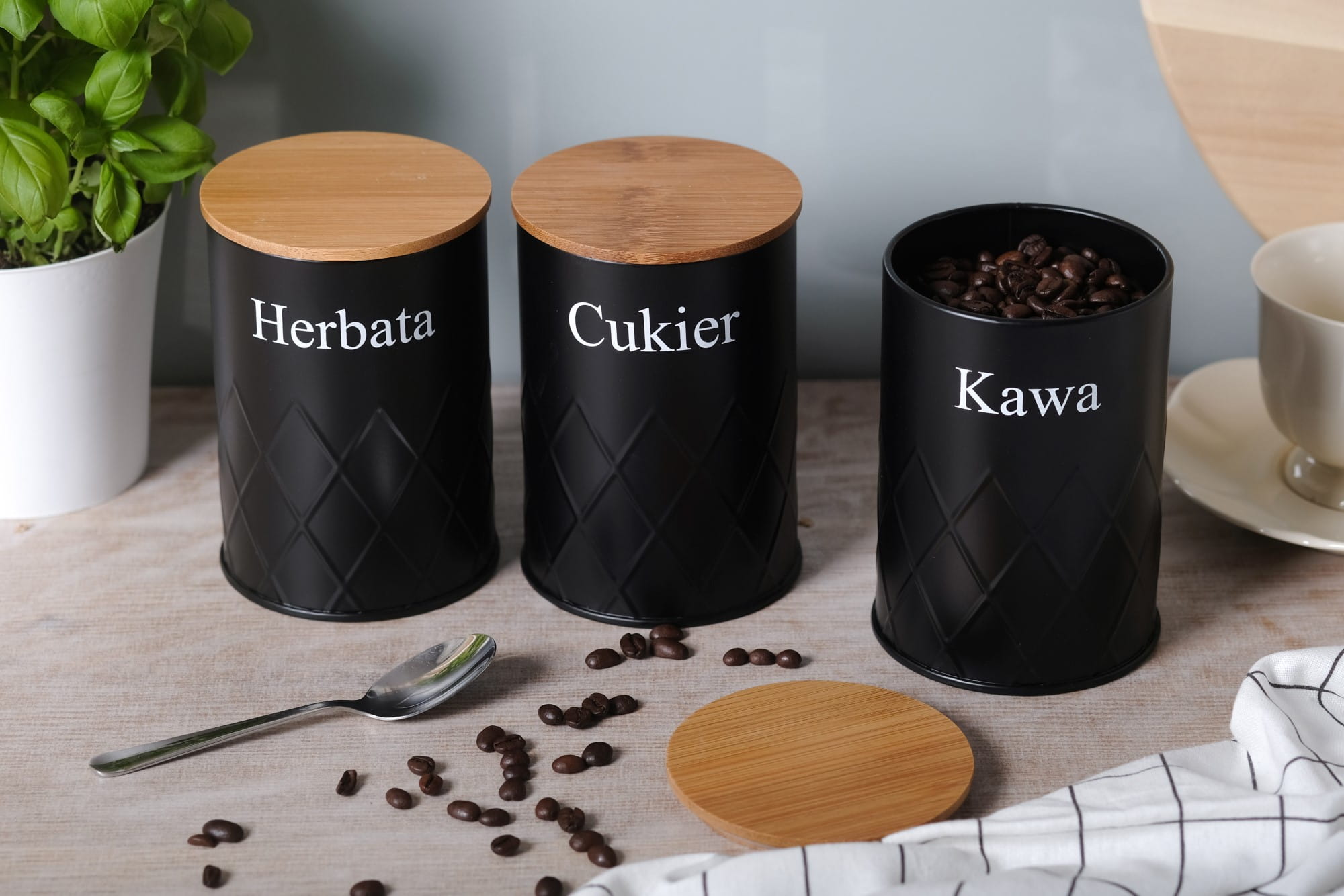A set of 3 containers for storing coffee, tea and sugar.