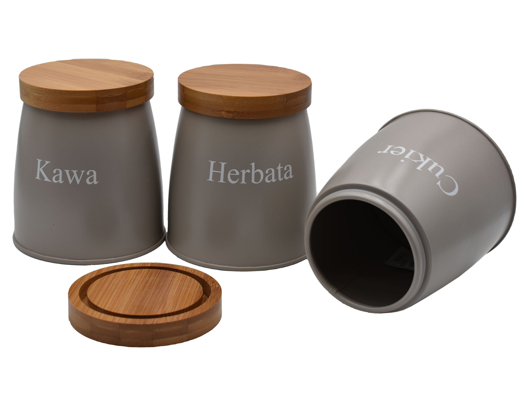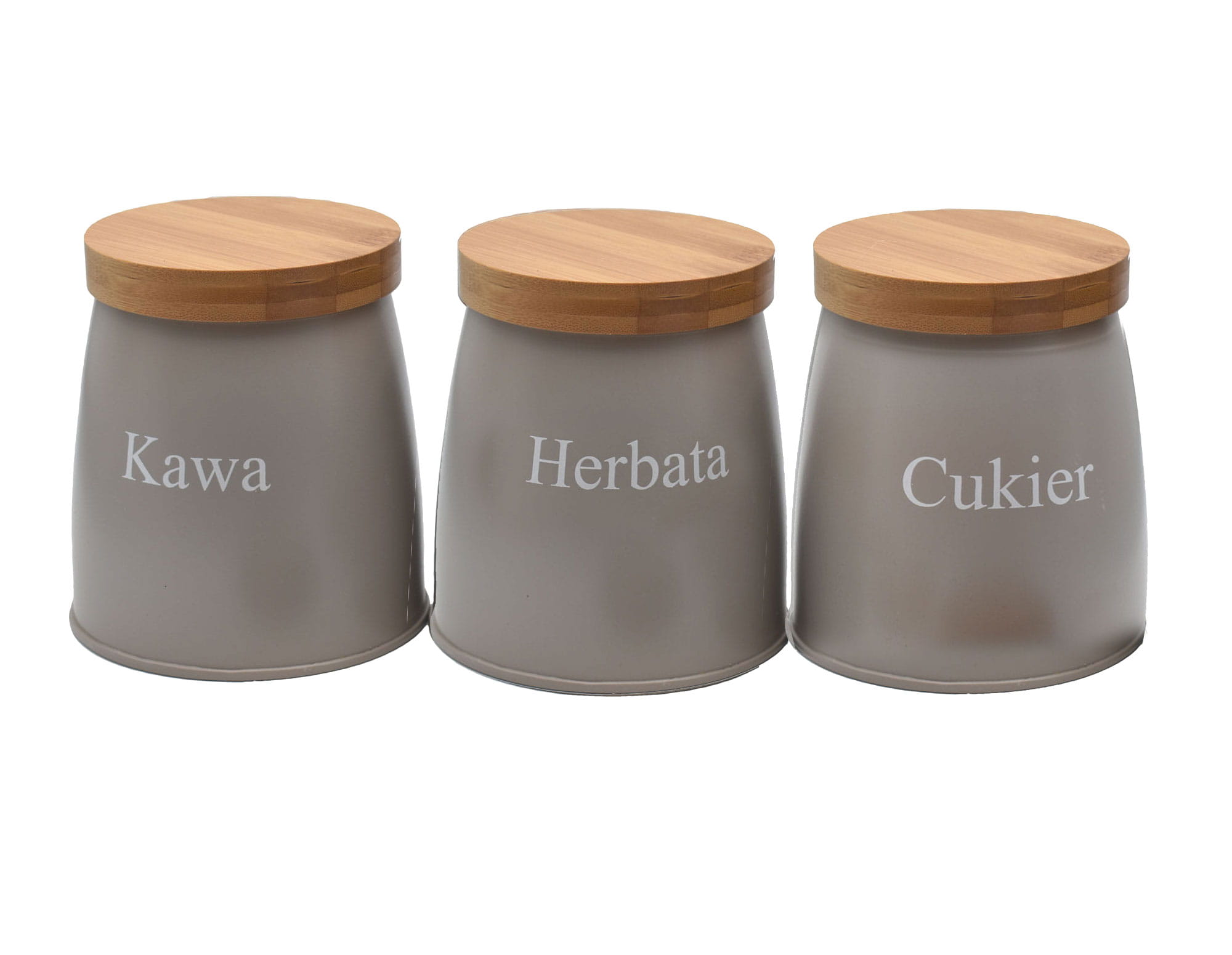 A set of 3 containers for storing coffee, tea and sugar.