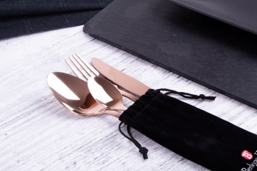 Put the cutlery in the special canvas case and take it with you to the office, restaurant, on a trip, on a picnic. They will fit in your bag or pocket. Available in a fashionable, modern and elegant rosegold colour. It has a mirror effect while being made of high-quality stainless steel.