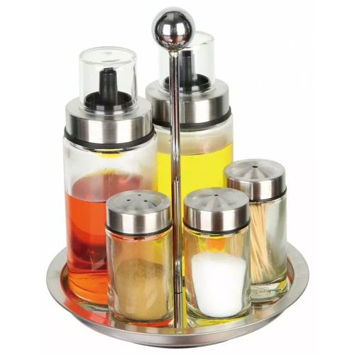 The set includes 2 dispensers, salt shaker, pepper shaker, toothpick holder and rotary stand.