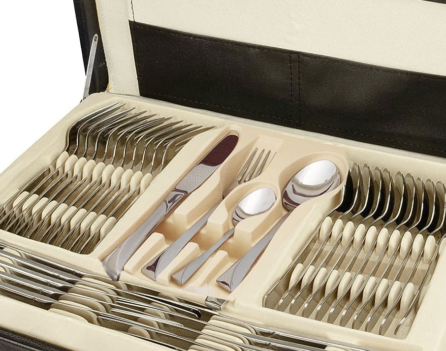Elegant high-end cutlery made of chrome-nickel stainless steel. Packaged in an aluminium case with imitation wood. High-quality workmanship guarantees long-term use.