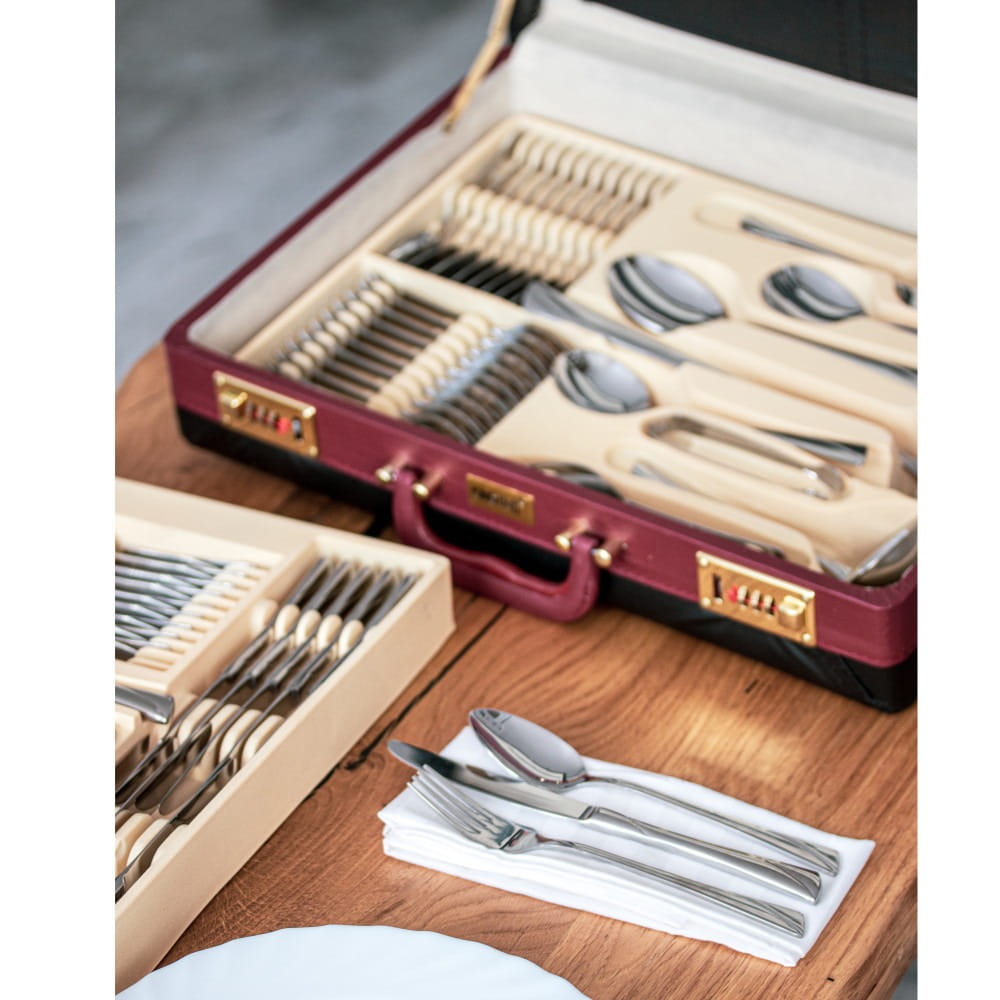 Elegant, high-quality cutlery made of chrome-nickel stainless steel. Packed in an aluminium case covered with ecological leather. The high manufacturing quality guarantees many years of use.