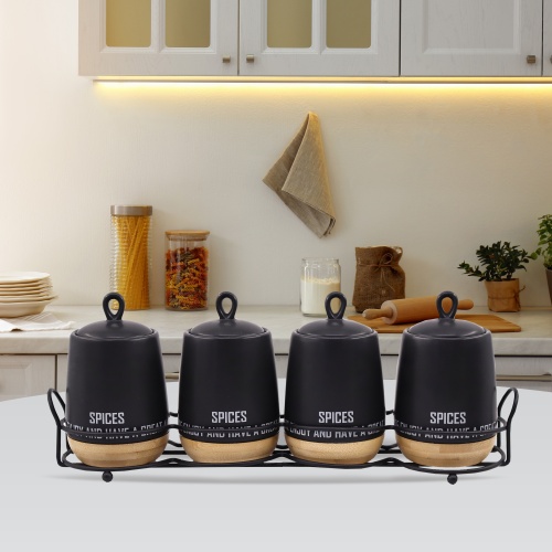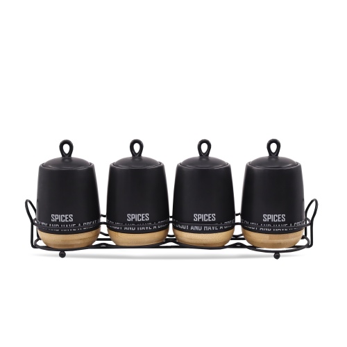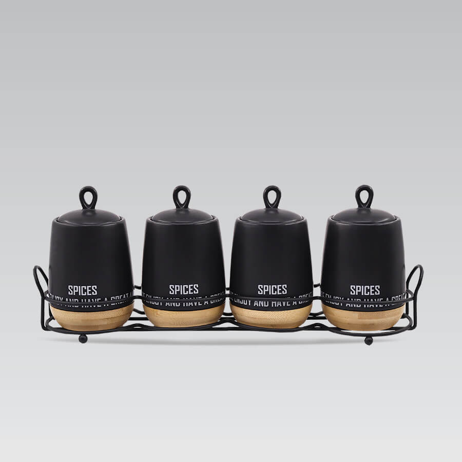 We present practical and stylishA set of ceramic containers for spice maestro- an ideal solution for people who value aesthetics, durability and convenience of use. The set consists of4 containers made of high quality ceramics and bambooand stablemetal rack, which facilitates organization in the kitchen.