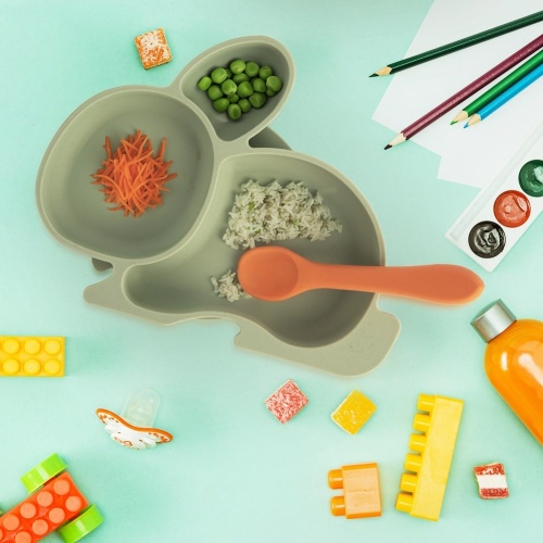 A children's plate in the shape of a bunny. Made of silicone, with a strong suction cup. Three separate compartments allow you to serve a variety of meals.