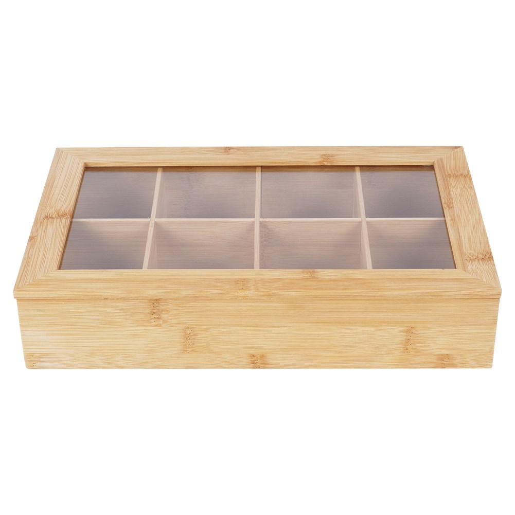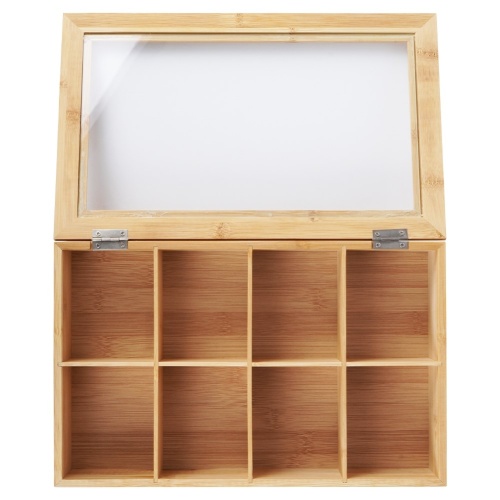 - USEFUL- Container for storing tea bags. It has 8 compartments in which we can place our favorite teas. The container has dimensions of 32 x 20 x 6.5 cm. The compartments have dimensions of 9 x 7.5 x 5.5 cm.