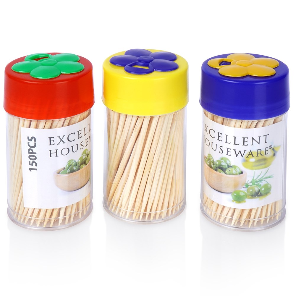 - PRACTICAL- Set of three packs of wooden cocktail toothpicks. Each package contains 150 pieces of toothpicks. Toothpicks packed in a convenient plastic box. The length of each toothpick is 6.5 cm.