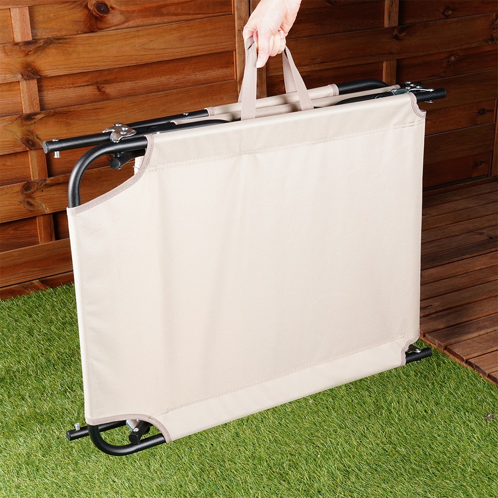Beige garden lounger. Possibility to set a comfortable seating position, which will ensure comfortable use. The deckchair will allow you to relax for a while, also in a flat position. We can use it both in the garden and, thanks to the foldable feature, we can take it with us to the beach, on a trip or camping.An original product of the Dutch brand RedCliffs.Manufactured in accordance with European standards.
