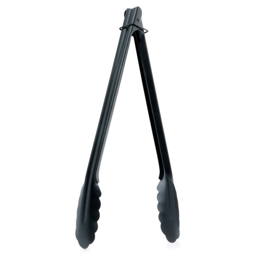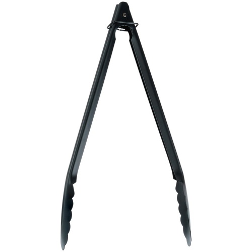 Tongs helpful when turning over fried, baked, grilled products and when serving dishes. Made of black stainless steel.