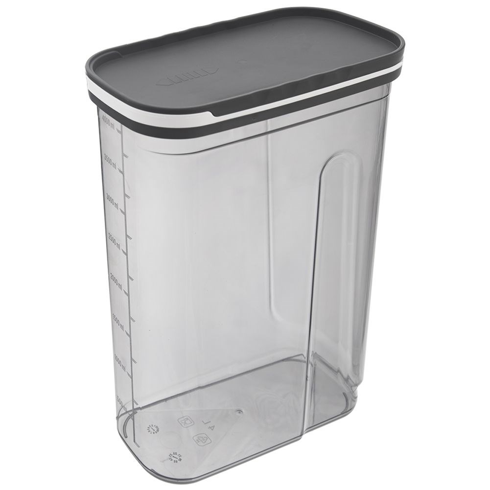 - Disposing- a container with dosing closure is suitable for storing flour, grain, groats, sugar, breakfast flakes and other loose products. The container has dimensions of 21.5 x 11.5 x 28.5 cm and a capacity of 4 liters.
