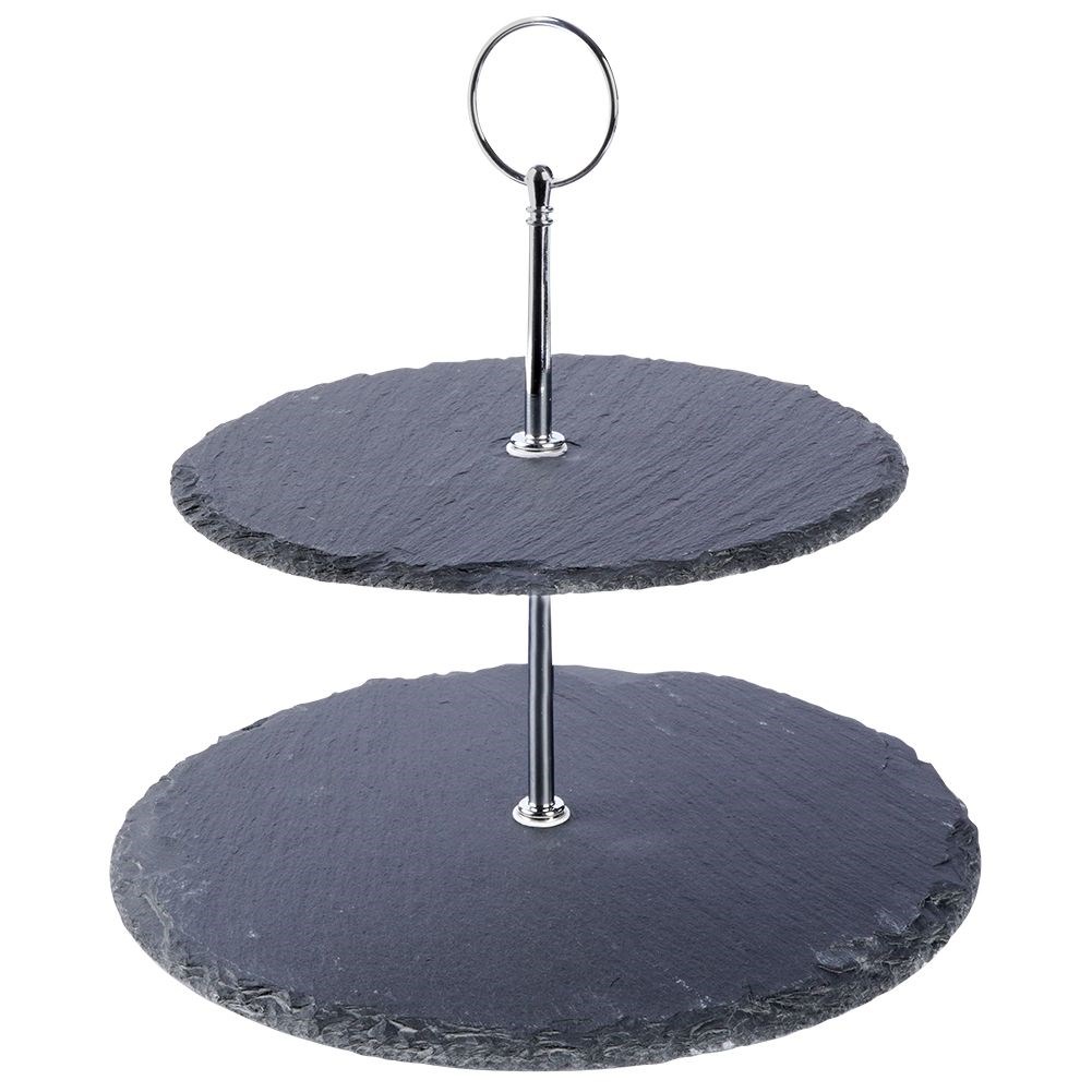 A tiered cake stand for cookies, cake, fruit, appetizers and snacks. It has 2 levels consisting of trays made of gray slate stone.