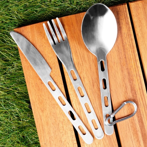 Tourist cutlery set with a carabiner: spoon, knife and fork. Made of stainless steel. Useful when camping, camping and traveling.