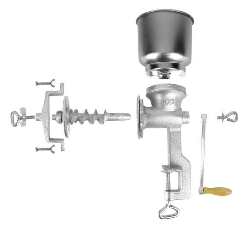 Grain and oily grist such as linseed. Whether coarse or fine, the grain size is individually and continuously adjustable by turning the crank to the left or right. The robust steel grinder enables stepless grinding and the plastic hopper for easy filling. For good stability, mount the mill to the table or worktop with the locking screw. Cleaning by hand is recommended.
