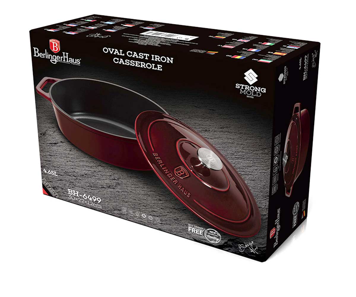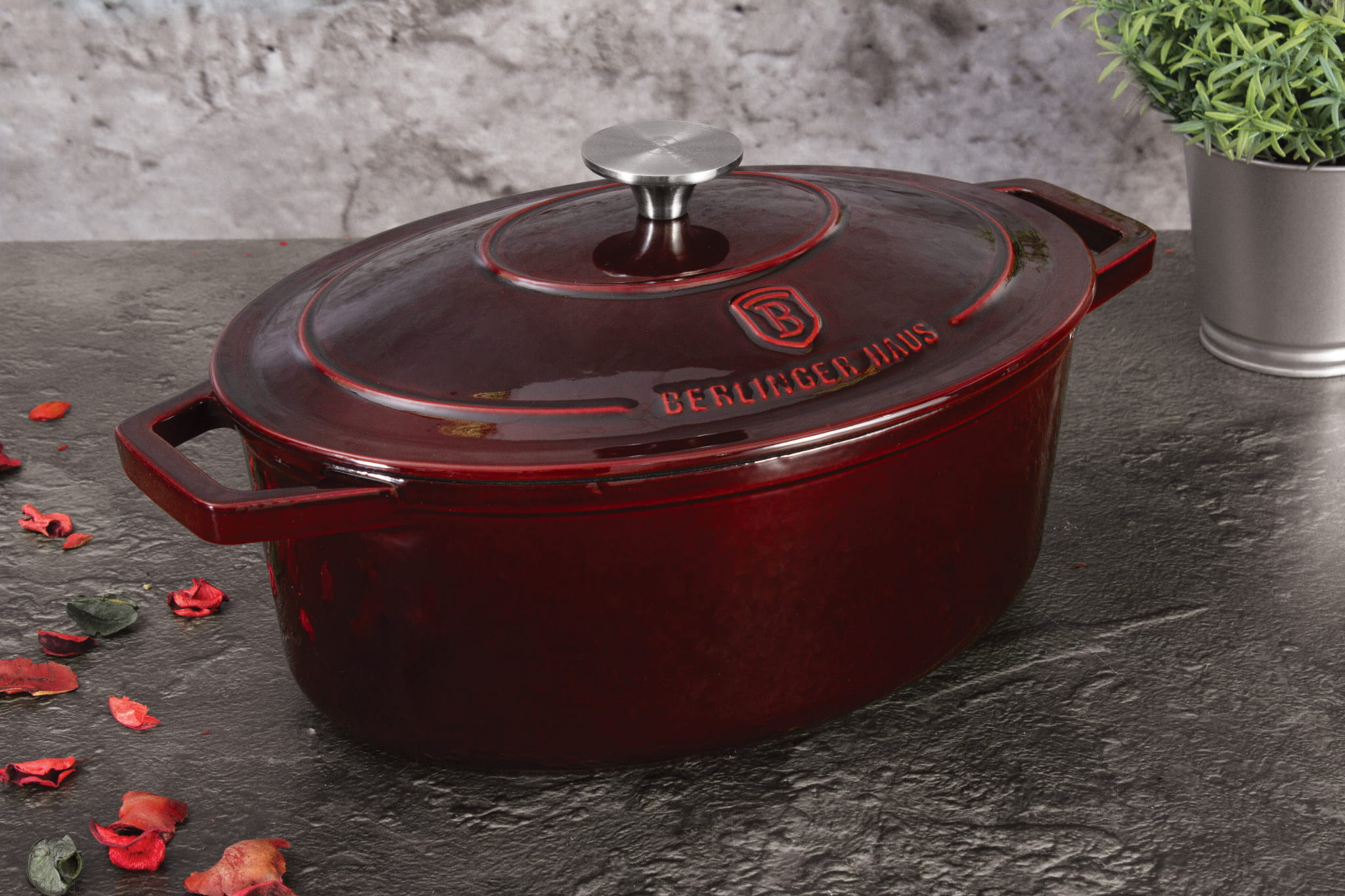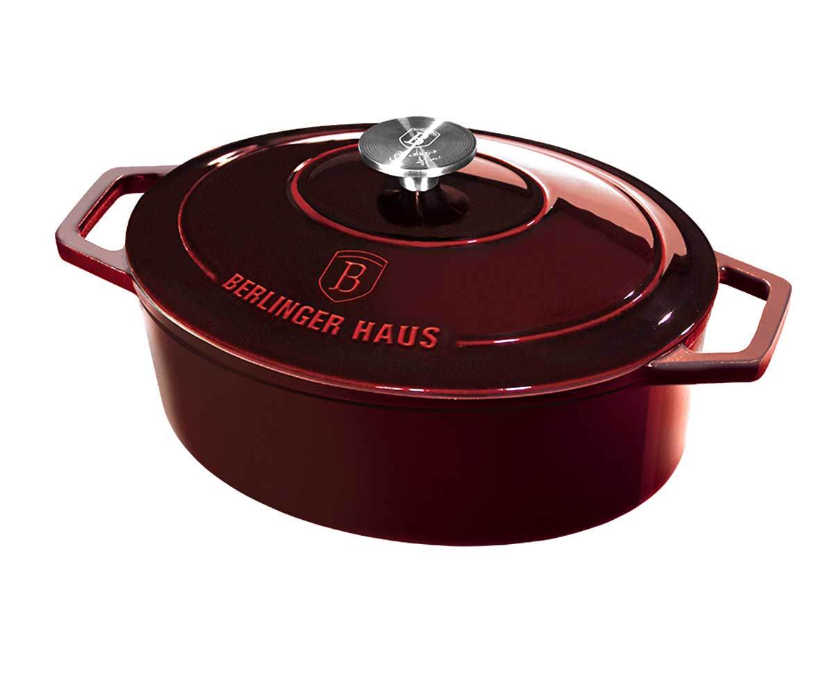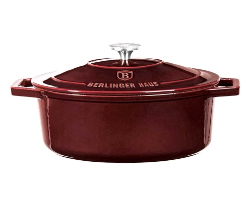 4.65L roaster made of cast iron BERLINGER HAUS Strong Mold. Very heavy. The edge-free profiled bottom makes it easy to put food on and keep the pot clean. It is resistant to abrasion and high temperatures. Deep, ideal for frying and baking.